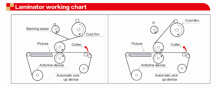 1. Media use-up reminder, machine will stop laminating when media using up, avoid the film sticking to roller.